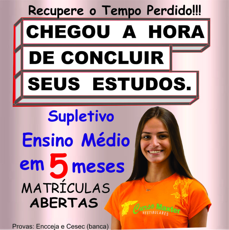 O SUPLETIVO MAXOPÇÃO é o único curso preparatório para as provas da Secretaria de Educação em BH. Você pode concluir rapidamente todo o Ensino Fundamental (1º grau – 6º ao 9º ano) ou concluir todo Ensino Médio (2º grau – 1º ao 3º ano) em 5 meses, com aulas de segunda à sexta no horário da manhã e segunda a quinta no horário noturno. Ao final do curso você faz as provas nas redes oficiais (Secretaria de Educação, que serão marcadas pelos alunos, ou ENCCEJA, que é aplicada 1 vez ao ano em data a ser definida pelo MEC). Para se submeter aos exames os candidatos têm que ter, até a data da prova, a idade mínima exigida para o Ensino Médio que é de 18 (dezoito) anos completos e para o Ensino Fundamental que é de 15 (quinze) anos completos. O candidato será aprovado, em cada área de conhecimento (prova), desde que obtenha o mínimo de 50% (cinquenta por cento) dos pontos atribuídos à prova. Aquele que não conseguir aprovação em todas as provas inscritas poderá, no próximo exame, se inscrever para eliminar somente a prova em que foi reprovado. O Supletivo MaxOpção é a forma mais rápida e segura de conquistar o seu diploma.